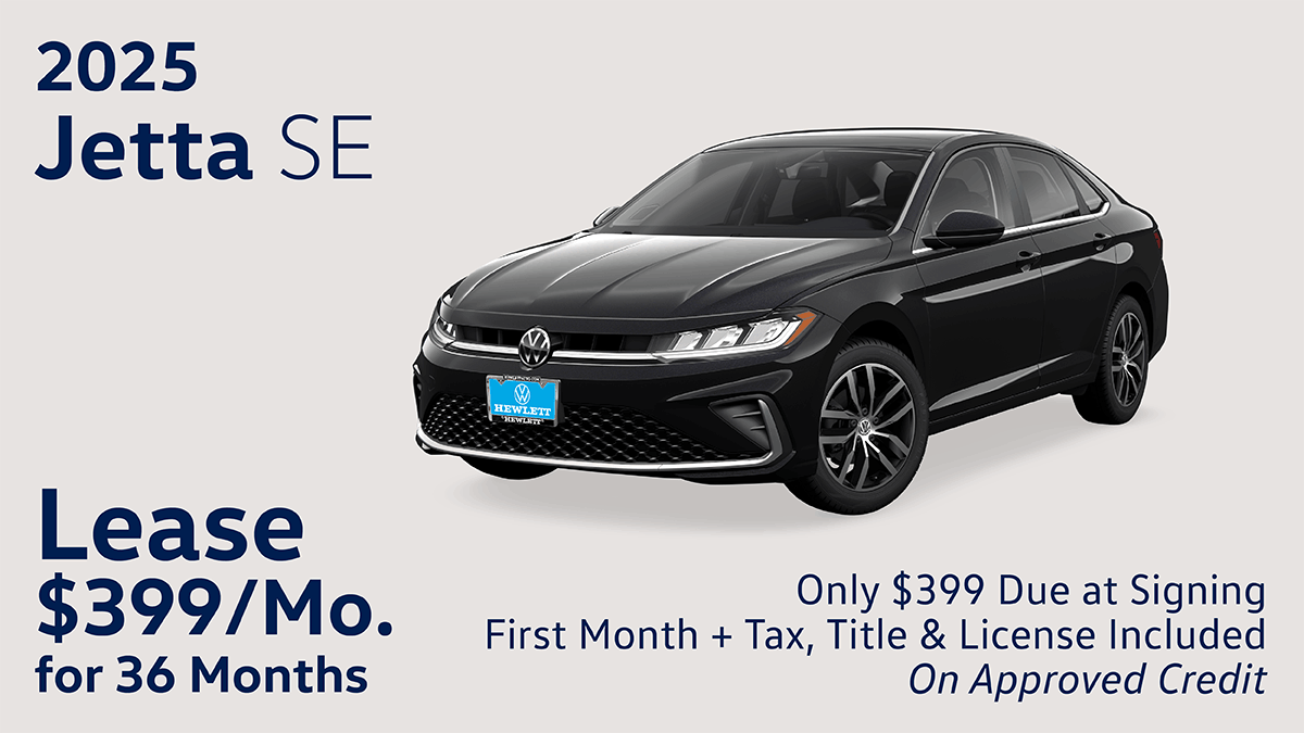 Three Ways to SAVE! ONE: Lease a new 2025 Volkswagen Jetta SE for $399 *Includes 2 years of maintenance! 36-month lease Stock #V251189. $399 down due at signing. INCLUDES First Payment, tax, title, license and fees. No security deposit required. 7,500 mi per year. For highly qualified customers through Volkswagen Credit. In stock units only. Closed end lease financing. Monthly lease payment based on MSRP of $28,130 and destination charges, less a suggested dealer contribution resulting in an initial capitalized cost of $25,.465 Monthly payments total $14,364 Residual $15,472. at lease end purchase option. Your payment will vary based on dealer contribution and the final negotiated price. At lease end, lessee responsible for disposition fee of $395, $0.20/mile over 22,500 miles and excessive wear and use. VIN 3VWEX7BU5SM108461. CDK 168980 Year Maintenance: VW’s Carefree Maintenance program provides the 10,000- and 20,000-mile scheduled maintenance services or scheduled maintenance services for two years (whichever occurs first) as stated in the vehicle’s maintenance booklet on all new MY25 vehicles. See dealer for details. The Carefree Maintenance program does not provide tire rotations, or other services or parts not specified in the owner’s literature