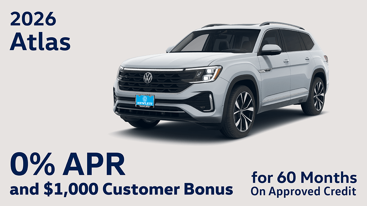 APR offer for well-qualified customers. 0% APR, no down payment required, available on new, unused 2026 Atlas models (excludes Atlas Cross Sport) financed by Wells Fargo. Example: For 0% APR, monthly payment for every $1,000 you finance for 60 months is $16.67. Not all customers will qualify for credit approval or advertised APR. Subject to credit approval by Wells Fargo. Offer ends April 30, 2026. Volkswagen of America, Inc. will apply a $1,000 Customer Bonus when you finance the purchase of a new, unused 2026 Atlas (excludes Atlas Cross Sport) from March 3, 2026 to April 30, 2026. Bonus applied toward the purchase when using Wells Fargo Special APR programs only and is not redeemable for cash. Bonus cannot be redeemed on Fleet or Dealership Sale Program.