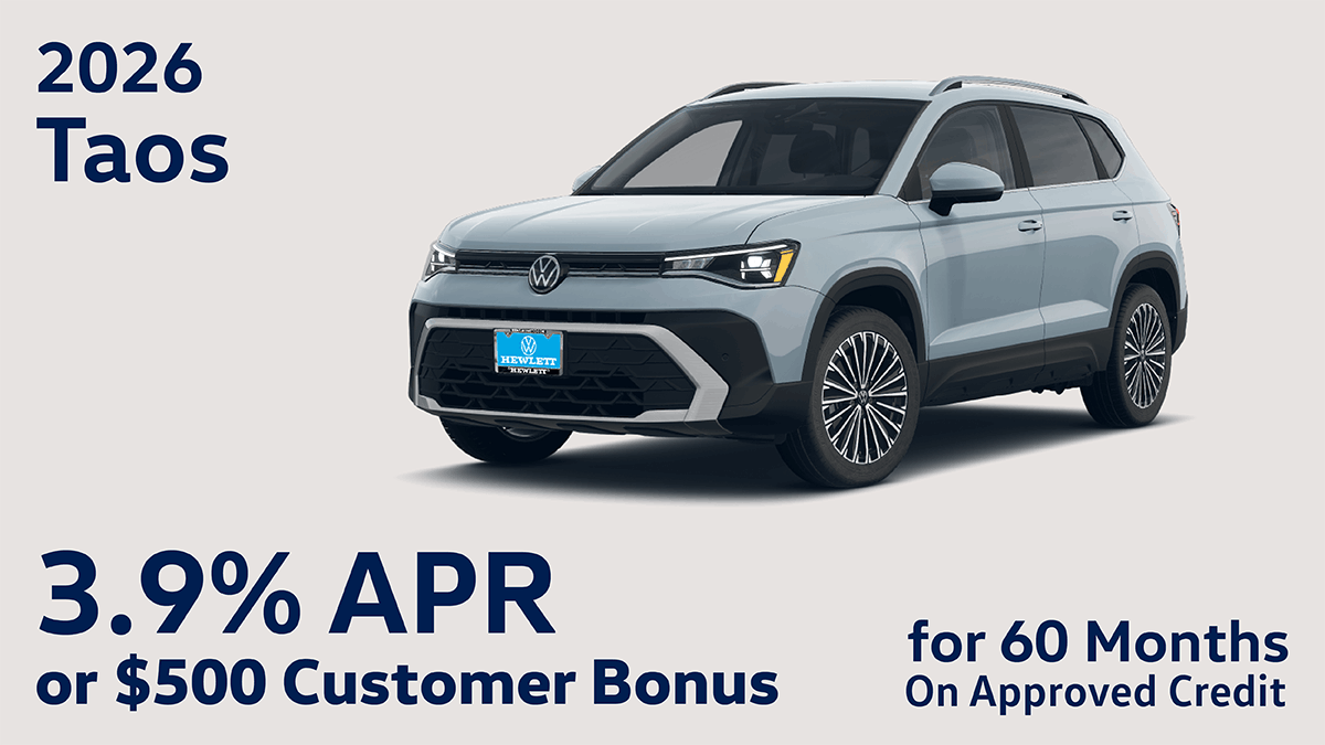 APR offer for well-qualified customers. *3.9% APR, no down payment required, available on new, unused 2026 Taos models financed by Wells Fargo through participating dealers. Example: For 3.9% APR, monthly payment for every $1,000 you finance for 60 months is $18.37. Not all customers will qualify for credit approval or advertised APR. Subject to credit approval by Wells Fargo. Offer ends April 30, 2026. Volkswagen of America, Inc. will apply a $500 Customer Bonus when you lease or purchase a new, unused 2026 Taos through participating dealers from March 3, 2026 to April 30, 2026. Bonus cannot be combined with discounted Volkswagen Financial Services Special Lease or Wells Fargo Special APR Programs, or on Fleet or Dealership Sale Program vehicles. Bonus applied toward lease or purchase and is not redeemable for cash.