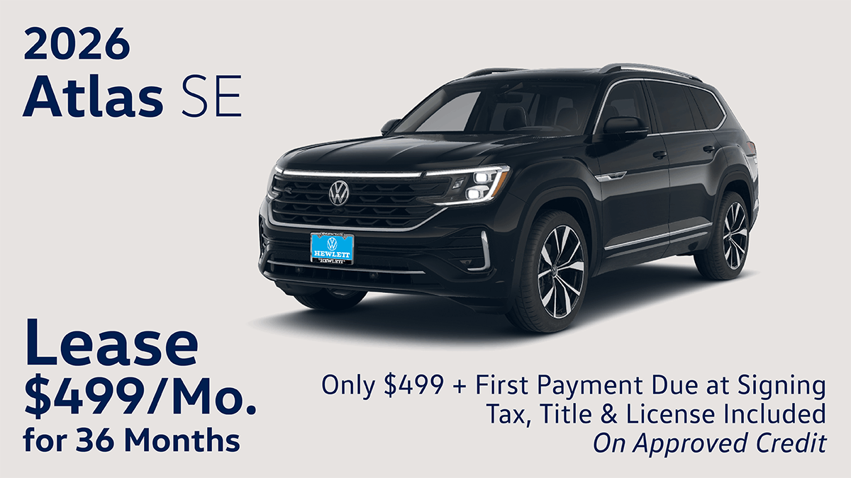 Two Ways to SAVE! ONE: Lease a new 2026 Volkswagen Atlas SE for $499 *Includes 2 years of maintenance! $499 due at signing, plus 1st monthly payment. Includes tax, title, license, options and dealers fees. No security deposit. On Approved Credit. Monthly lease payment based on a MSRP of $41,672 and destination charges, less a suggested dealer contribution resulting in a initial capitalized cost of $40,260 Monthly payments total $16,164. CDK 168993 Stock no V,26131 VIN 1V2DN2CA5TC523891 Monthly Payments total $17,964 At lease end, lessee responsible for disposition fee of $395, $.20/miles over 30,000 miles and excessive wear and use. A $395 fee applies if you purchase your lease vehicle. TWO: VW’s Carefree Maintenance program provides the 10,000- and 20,000-mile scheduled maintenance services or scheduled maintenance services for two years (whichever occurs first) as stated in the vehicle’s maintenance booklet on all new MY26 vehicles. See dealer for details. The Carefree Maintenance program does not provide tire rotations, or other services or parts not specified in the owner’s literature.