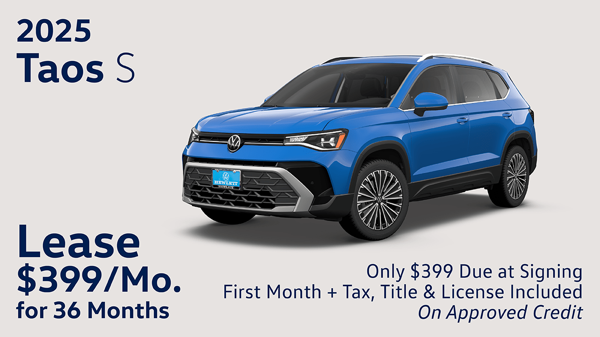Two Ways to SAVE! ONE: Lease a new 2025 Volkswagen Taos S for $399 *Includes 2 years of maintenance! 36-month lease Stock #V250891. Only $399 due at signing includes first payment, tax, title, license and fees. 7,500 miles per year. No security deposit required. For highly qualified customers through Volkswagen Credit. In stock units only. Closed end lease financing. Monthly lease payment based on MSRP of $27,416 and destination charges, less a suggested dealer contribution resulting in an initial capitalized cost of $25,776 Monthly payments total $14,364. Residual $15,353 + tax at lease end purchase option. Your payment will vary based on dealer contribution and the final negotiated price. At lease end, lessee responsible for disposition fee of $395, $0.20/mile over 22,500 miles and excessive wear and use. VIN 3VV5C7B23SM057377. CDK 168828 TWO: VW’s Carefree Maintenance program provides the 10,000- and 20,000-mile scheduled maintenance services or scheduled maintenance services for two years (whichever occurs first) as stated in the vehicle’s maintenance booklet on all new MY25 vehicles. See dealer for details. The Carefree Maintenance program does not provide tire rotations, or other services or parts not specified in the owner’s literature