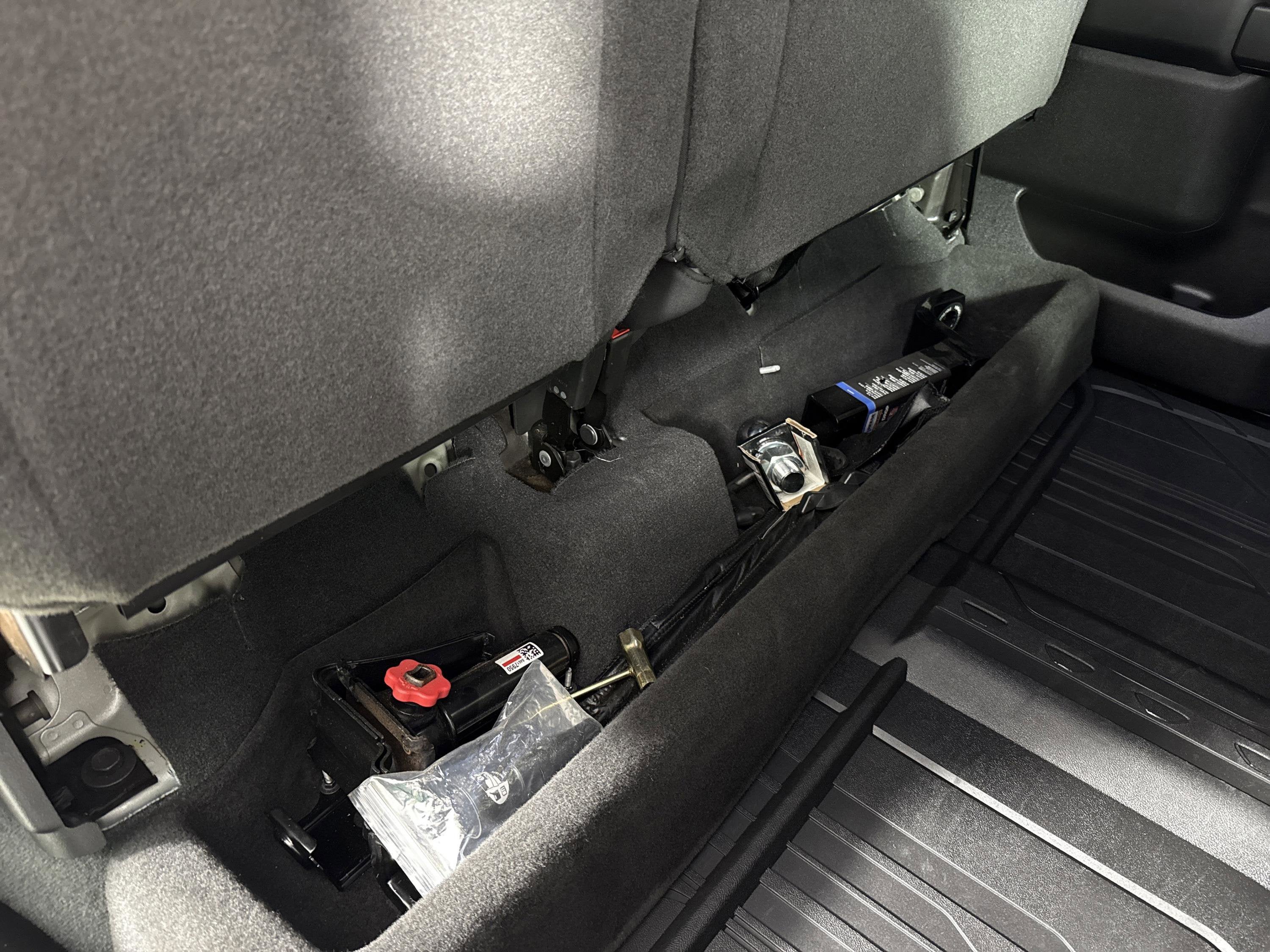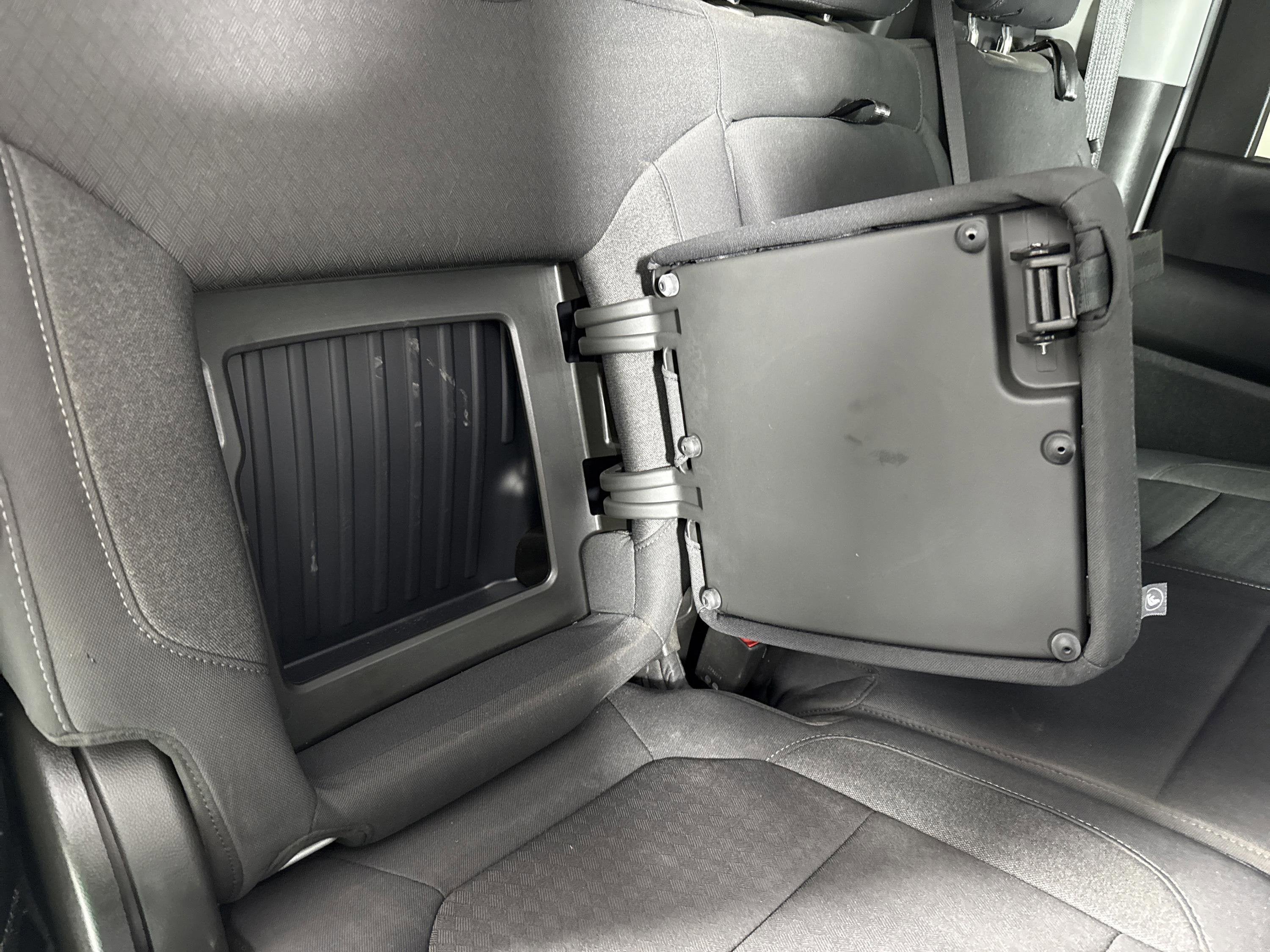 - SEAT CLOTH REAR WITH STORAGE PACKAGE 60/40 folding bench for Crew Cab models includes seatback storage on left and right side center fold out armrest with 2 cupholders (includes child seat top tether anchor)