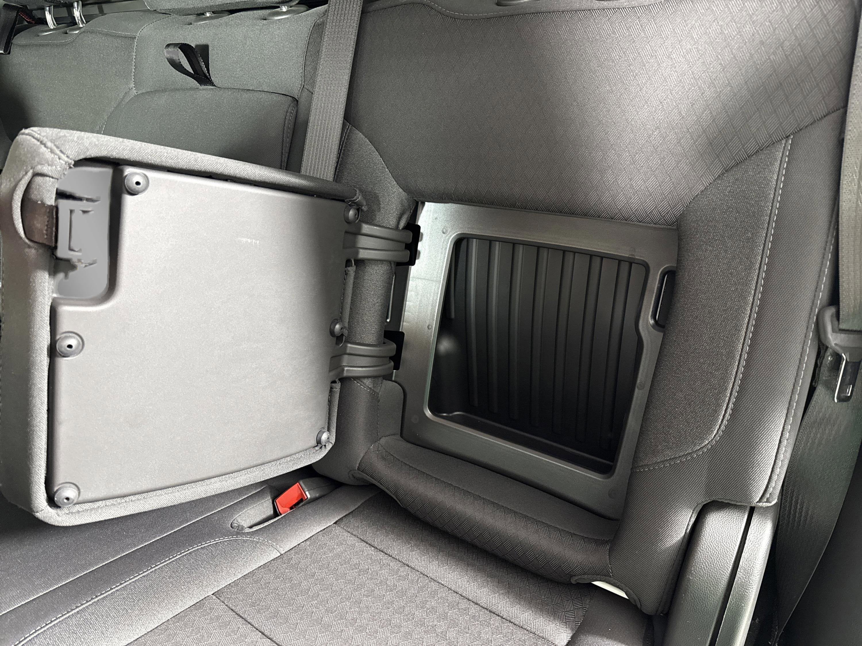 - SEAT CLOTH REAR WITH STORAGE PACKAGE 60/40 folding bench for Crew Cab models includes seatback storage on left and right side center fold out armrest with 2 cupholders (includes child seat top tether anchor)